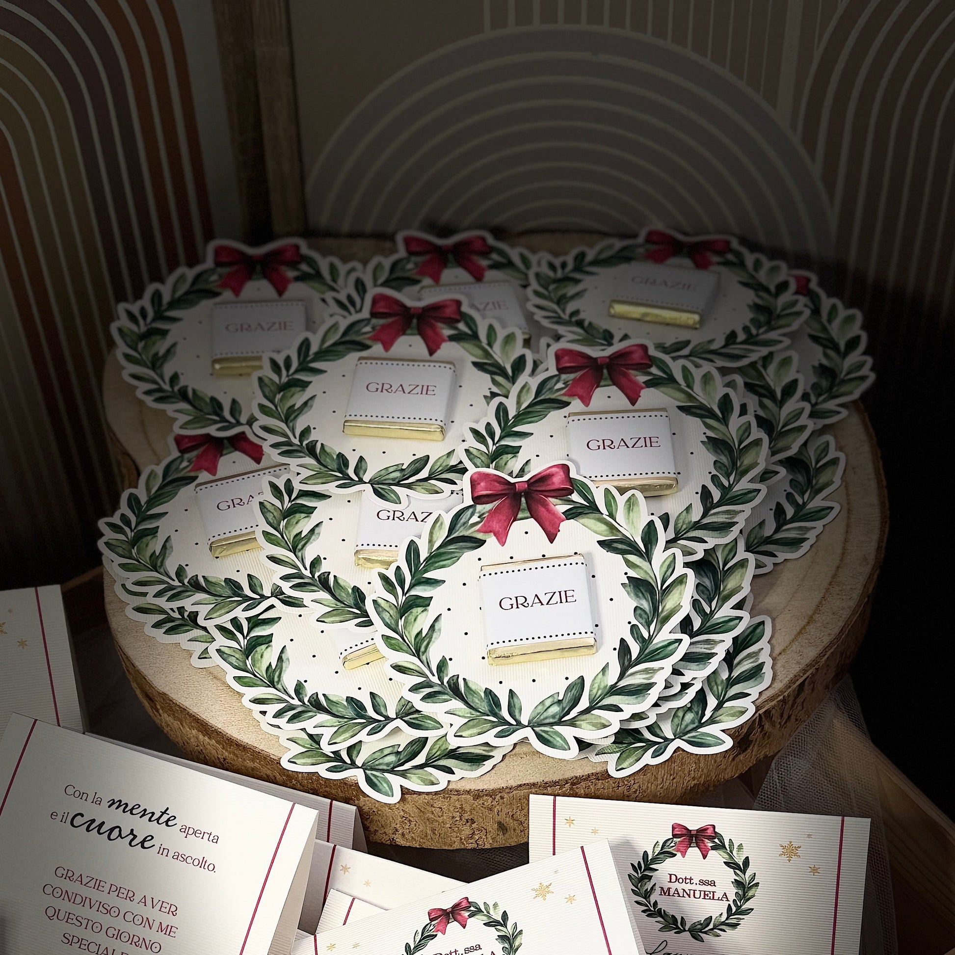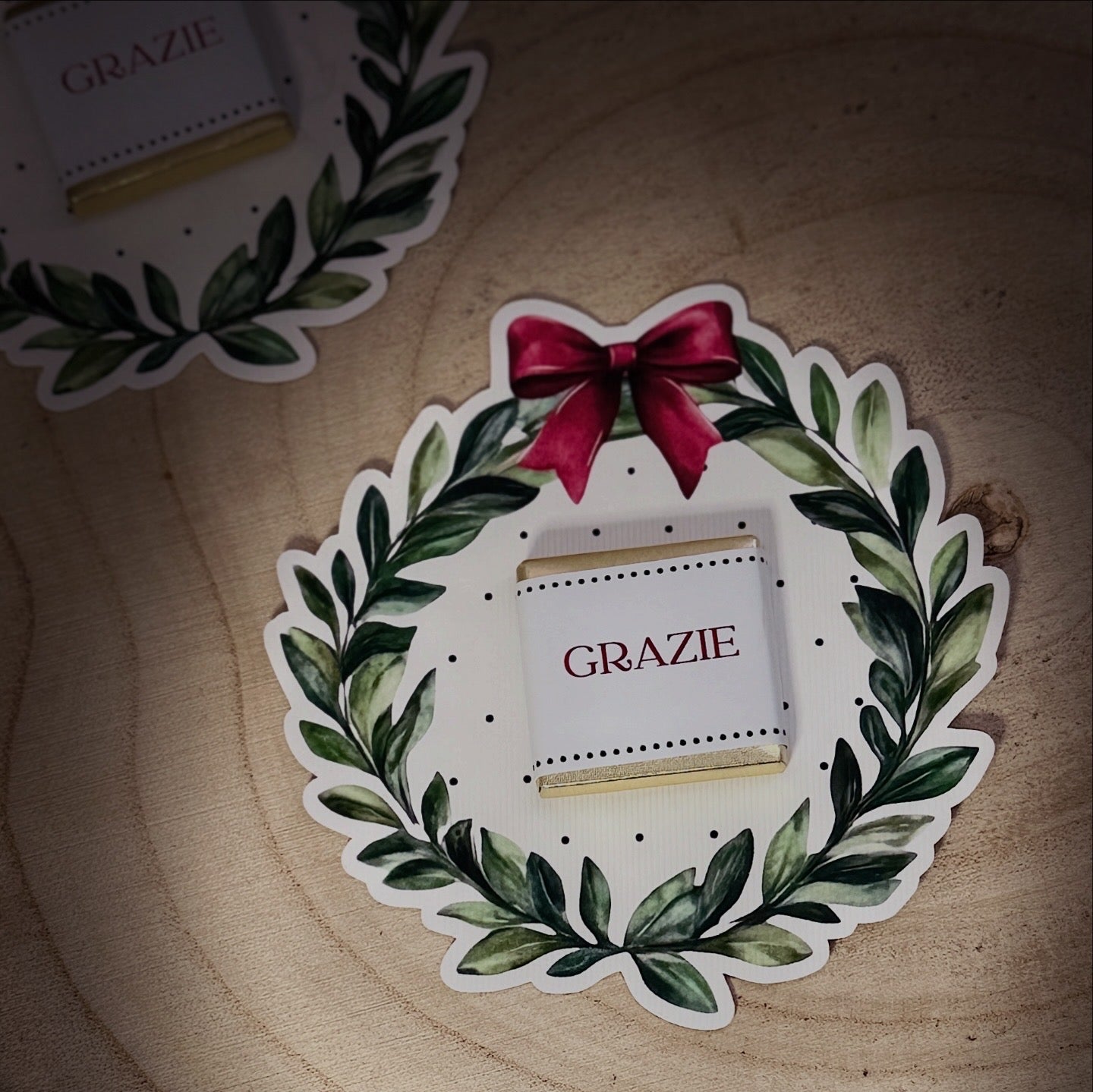 Segnaposto caratterizzato da una ghirlanda sagomata e da un cioccolatino personalizzato con la scritta “GRAZIE”. Un tocco elegante e caldo che completa la mise en place e accoglie gli ospiti con un gesto gentile.